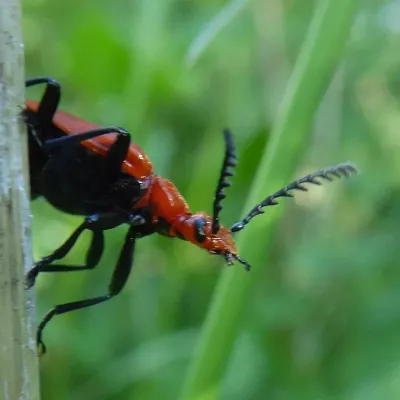 We note other species as we wander along: Hazel, the catkins are long gone but with the promise of autumn nuts. Dogwood, branches once used for skewers, with beautifully curved leaves which will turn crimson in autumn are now covered in white flowers. Elder, needs no introduction, sweetest of blossom, perfect for home-made cordial - we see speckled with tiny flies, and then spot a lurking red-headed Cardinal Beetle preying on them. Native woodland trees, Oak, Ash and Field Maple, cut back in their prime, still flourish in ‘bonsai’ form within the hedgerow complex.