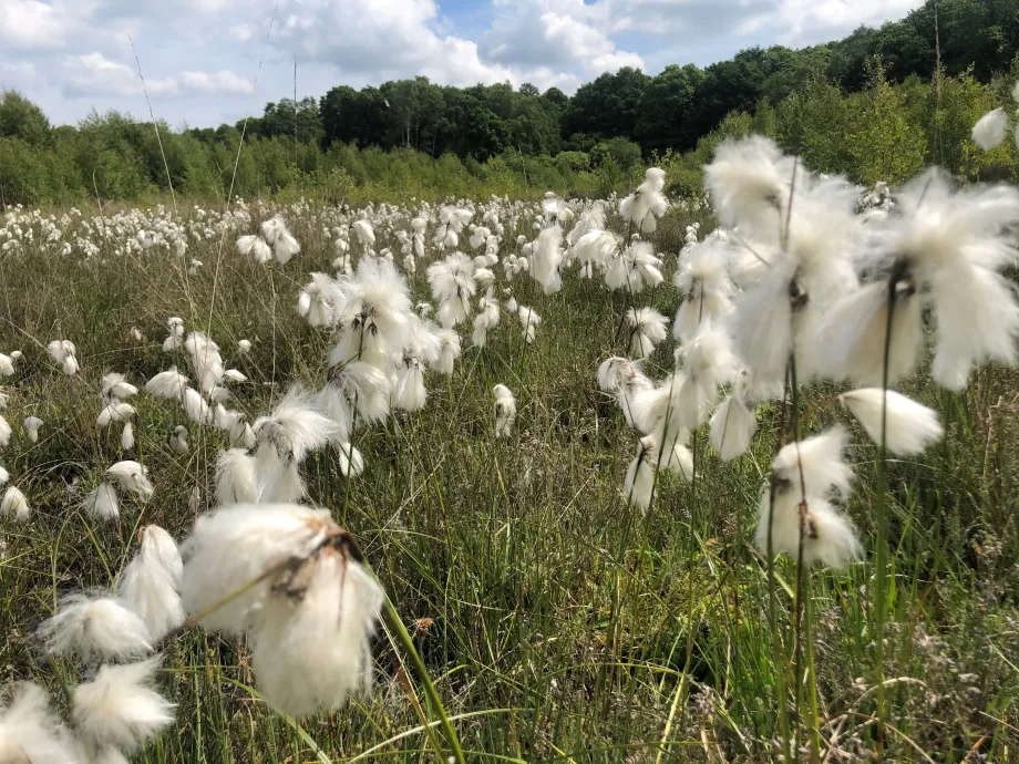 The spectacle of the cottongrass, Eriophorum angustifolium, dancing in the wind in the top bog, the most acid of the bogs, has been commented on a lot this summer. The gleaming white blobs are fairly tough filaments surrounding the small seedheads that develop from the discrete green and brown flowers typical of the sedge family that this plant is a member of. ‘Sedges have edges’ so stems are three-sided (although in the case of cotton grass, only at the top). It is wind-pollinated. One of four native species, it is native in a circle (transboreal) around northern Europe, Asia and America, surviving the harshest (usually cold and wet!) conditions, its tough rhizomes spreading vigorously where other plants won’t grow. So it’s a good indicator of where not to walk as it likes open, wet, peaty bog. The seedheads have been used to stuff pillows and were collected by children in Scotland for wound dressing in the First World War, but the fibres are too short to be spun into thread. It is a food plant for North American West Coast Nations. The scientific name is from the Latin for wool-bearing and narrow-leaved. Cottongrass (a sedge not a grass) is the county plant of Manchester but is very uncommon in Kent and the South-east. It is part of the very specialised flora that makes Hothfield Reserve such a significant place.