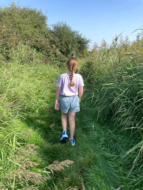 Paul's daughter walking through the tall green vegetation at Holborough Marshes