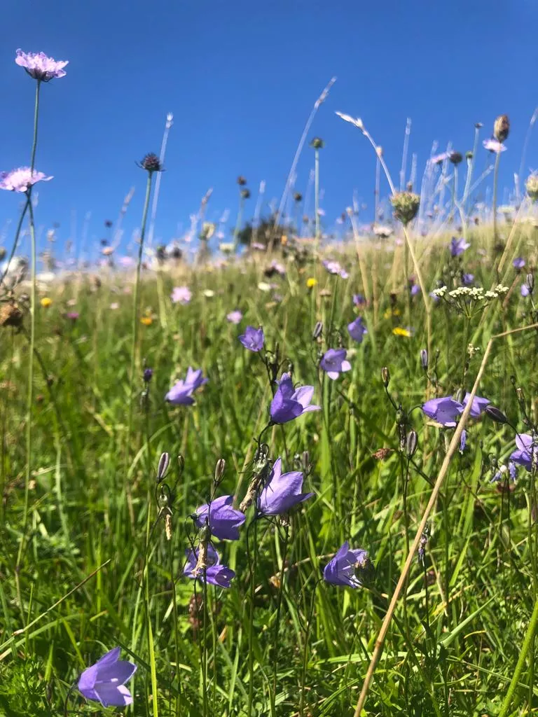 Harebells flowering in grassland in the foreground and a blue clear sky showing in the background ©Margery Thomas