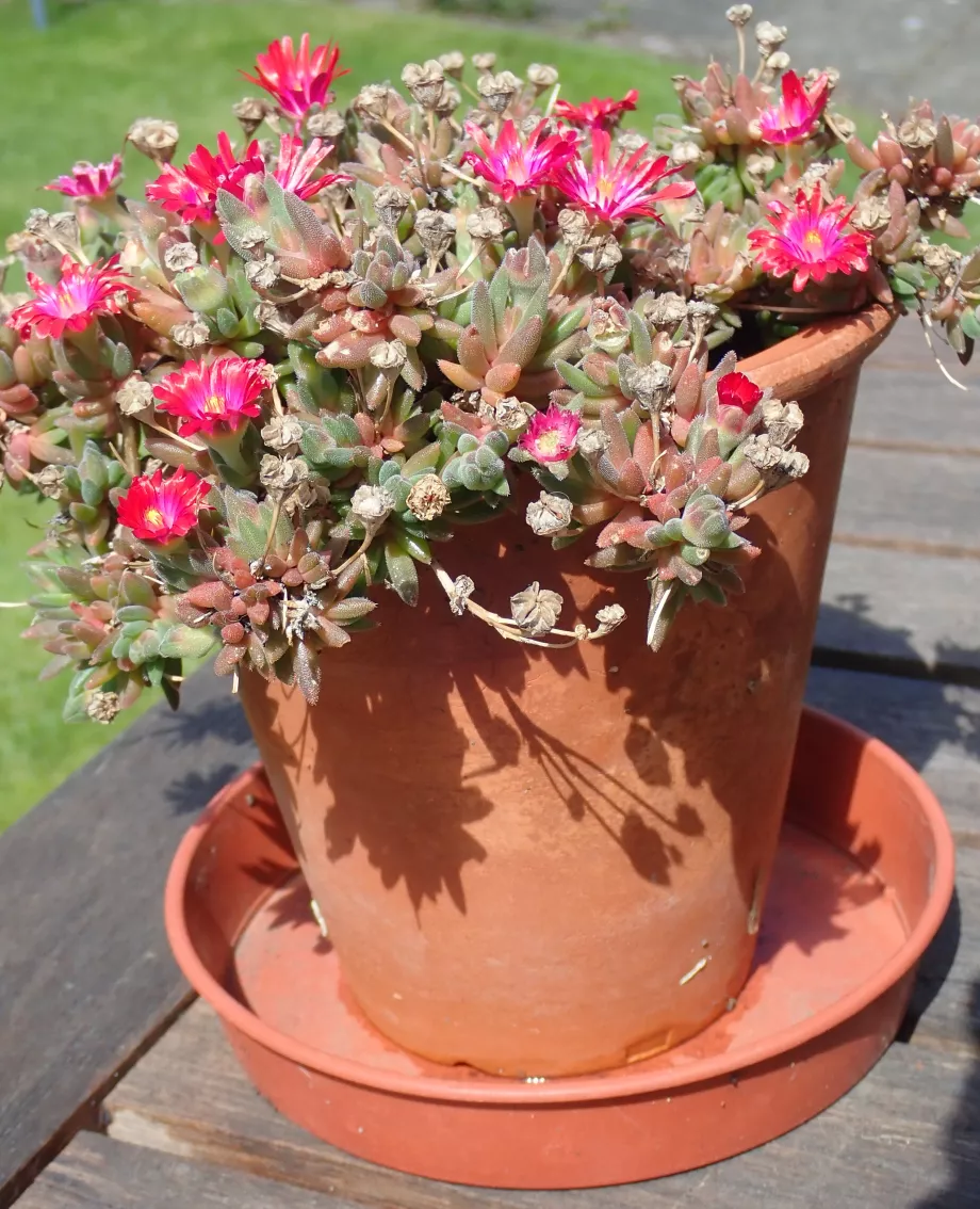 Delosperma surviving slugs in a pot on our garden table - P. Brook