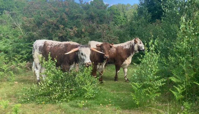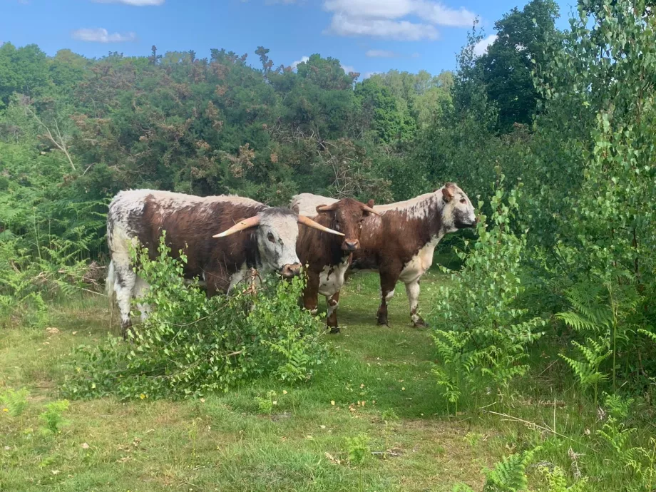 No bison are heading to Hothfield, but longhorn cattle, another conservation grazer, have been settling in here this summer. These gentle descendants of 16th and 17th century draft animals enjoy the unfertilised and, at times, tough all-year grazing here, controlling the more rampant plants to give space to a wider plant range, including the rare and less vigorous. Their hooves churn the soil creating pools for insects to hatch in and revealing invertebrates for birds to eat. They have a distinctive white line or finching along their back above dappled flanks, and a rosette of curls on their brow. Their spectacular horns, which can grow at quirky angles, used to be used for buttons, beakers, cutlery, and thanks to their translucency, lamps.