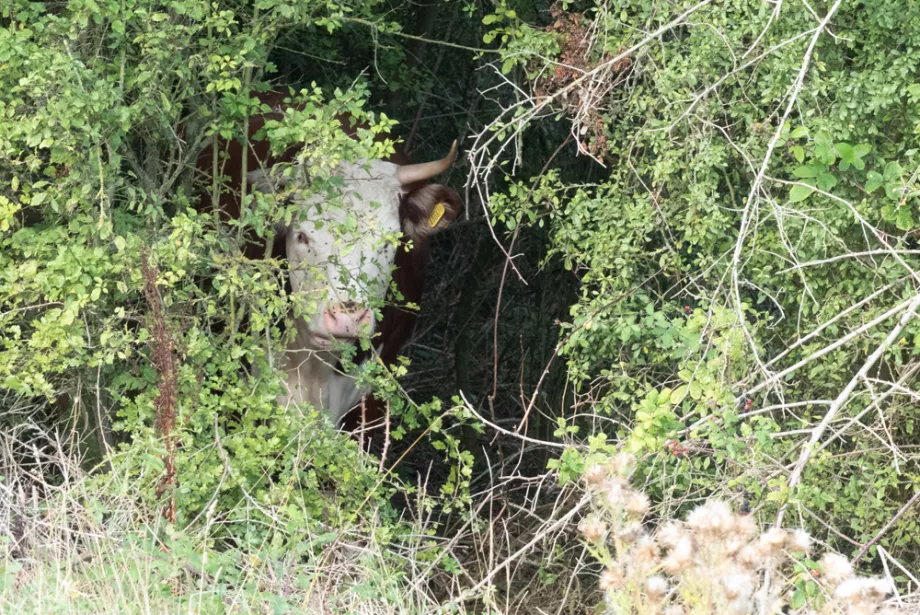 There are cattle on Wraik Hill during the months April to October and their number varies from four to eighteen. Currently, I look after four Herefords and four Sussex heffers. It’s amazing how such big animals can all disappear into a hedgerow. I once had fourteen smaller heffers all hiding within an overgrown hedge.