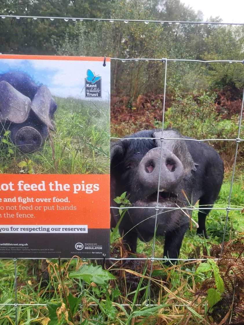 Pig behind a fence looking up at the camera next to a sign which says 'Do not feed the pigs' at Hothfield Heathland Nature Reserve ©Margery Thomas