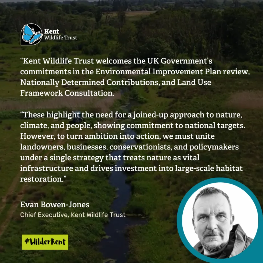 Kent Wildlife Trust welcomes the opportunity to respond to the consultation on the England Land Use Framework. We recognise the ambition to balance nature recovery, climate resilience, and economic growth, but the framework must recognise - amongst its specific objectives – from the outset – that we need to put 30% of the UK’s land area into genuine nature recovery. By recognising that nature is Nationally Significant Infrastructure to deliver long-term societal resilience, this can be done.