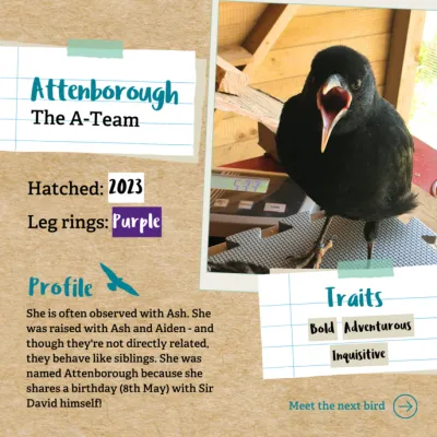 Attenborough is a hand-reared female with two purple leg rings. She was hatched at Paradise Park in Cornwall and is often observed with Ash, she was raised with Ash and Aiden, but is not directly related though they behave like siblings. She, like Ash, is one of the more adventurous birds and was named Attenborough because she shares a birthday (8th May) with Sir David himself!