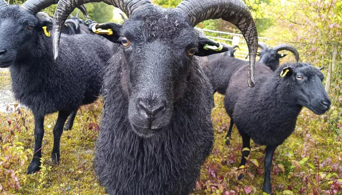 An all-black compact mountain sheep with a taste for bramble and young scrub. Both the males and females have horns, although the males' horns tend to be wider and longer, creating an attractive curl, rather than the backward sweep of the females'.