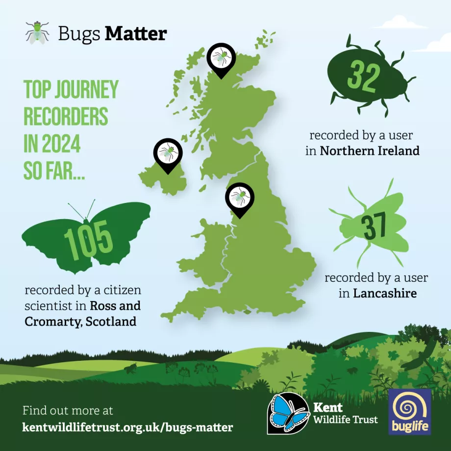 Dr Lawrence Ball, Kent Wildlife Ecological Data Analyst Lead shares: “Notably, participants in the South East have emerged as the front runners, having logged an impressive 1,279 journeys over the survey period so far. The East of England and Scotland are not far behind with 1,068 and 472 journeys, respectively, but there is still time for these regions and others to overtake before the end of September!”