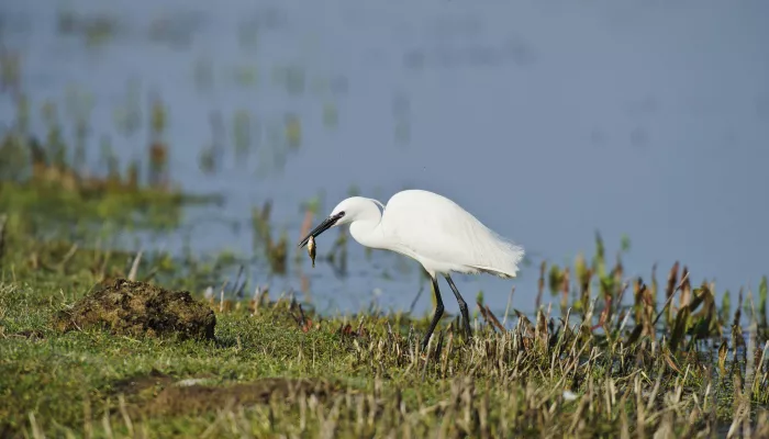 The little egret is a small, white heron that feeds on small fish and crustaceans. Once a very rare visitor from the Mediterranean, little egrets are now a common sight around the coasts of southern England and Wales as they expand their range, possibly due to increasing temperatures caused by climate change. It first bred in the UK on Brownsea Island, Dorset, in 1996, and has been moving northwards ever since; it was recorded as breeding in Berkshire for the first time in 2007.