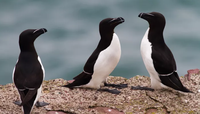 The razorbill has a characteristically thick, black bill, with a white stripe across it. It nests with other seabirds, such as guillemots, but prefers the lower ledges and rocky bottoms of cliffs and deep ravines.