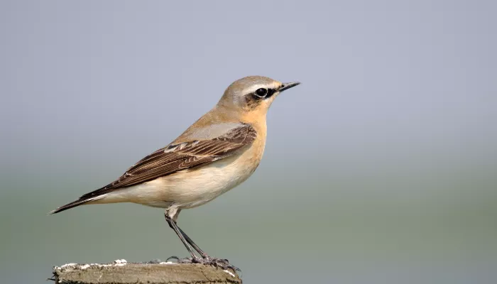 A summer visitor, the wheatear is a handsome chat, with black cheeks, white eyestripes, a blue back and a pale orange chest. Look for it on upland heaths and moors.