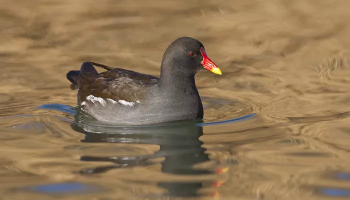 The moorhen can be distinguished from the similar-looking coot by its olive-black back (separated from its blue-black body by a white line), the white patches under its tail, and its red bill, which has a yellow tip.
