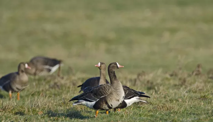The white-fronted goose is a winter visitor, arriving from Greenland and Siberia at the end of October, and returning north again at the end of March. It eats roots, shoots, tubers and leaves, as well as grains and oats.