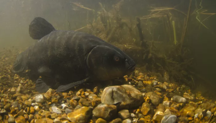 The tench is a medium-sized, heavy, deep-bodied fish. It can be found in soft-bottomed lakes and in slow-flowing rivers with plenty of vegetation. Tench are quite shy fish, hiding among dense weed. They feed on invertebrates, including pond snails and small pea mussels. Spawning in summer, males chase females, fertilising the eggs as soon as she has laid them in shallow beds of algae or vegetation.