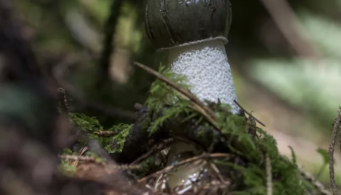 The spores of the stinkhorn are contained within the slime that covers its cap. Flies are attracted to the offensive-smelling slime, in turn, scattering the spores.
