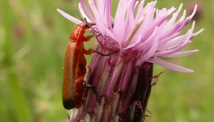 The common red soldier beetle is a medium-sized, narrow beetle commonly found on open-structured flowers, such as daises, cow parsley and hogweed, during the summer. It can be spotted on grasslands, along hedgerows, and in woodland, parks and gardens. Adults feed on aphids, and also eat pollen and nectar. Larvae prey on ground-dwelling invertebrates, such as slugs and snails, and live at the base of long grasses. The adults spend much of their short, summer lives mating, and can often be seen in pairs.
