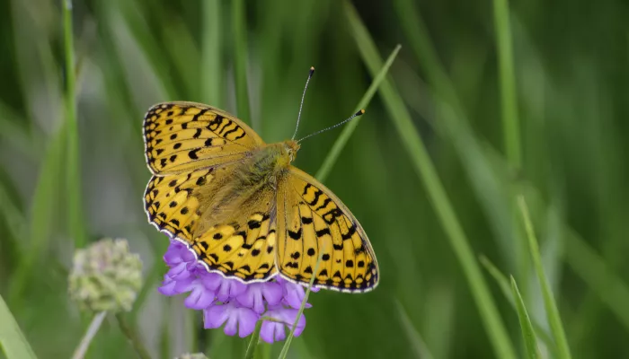 The dark green fritillary is a large, pale orange butterfly, with dark green undersides to the hindwings, hence its name. Adults are on the wing throughout the summer, from June to early September, but there is one generation per year. They live on chalk and limestone grassland, sand dunes and moorland, and in woodland rides, where the caterpillars feed on violets.
