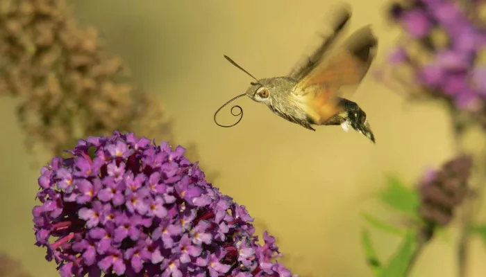 The humming-bird hawk-moth migrates to the UK from Southern Europe each year. It can be seen hovering over flowers, feeding with its long proboscis; its wings move so quickly that it 'hums'.