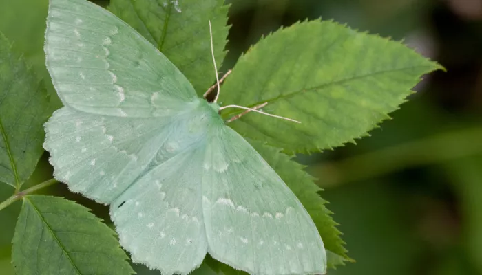 The large emerald is a big green moth found throughout most of the UK. They live in a wide range of habitats, particularly woodland, and scrubby grassland and heathland, but also parks and gardens. They fly at night and are attracted to lights, but will occasionally fly around tree canopies on sunny days.