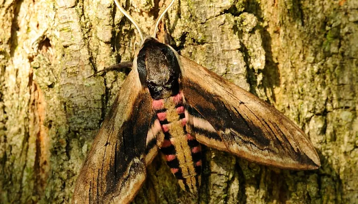 The hawk-moths are recognisable by their large, torpedo-shaped bodies and long, narrow wings, held back like a jet plane. The privet hawk-moth is one of the largest, with dark brown-and-cream wings, and a pink-and black-banded body.