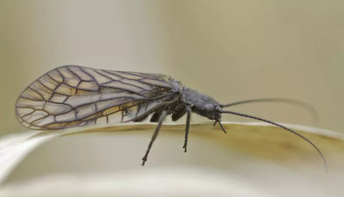 The Alder fly is a blackish invertebrate, with delicately veined wings that it folds over its body like a tent. It can be found near ponds and slow-flowing rivers; the larvae living in the silt at the bottom.