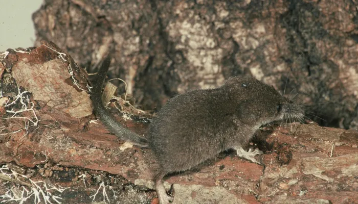 A small, insectivorous mammal, the pygmy shrew has tiny eyes and a large nose giving it a keen sense of smell. Shrews hectically snuffle through the undergrowth for their prey, which includes spiders and woodlice. Pygmy shrews can be found in most habitats. Active by day and night, they are very territorial and aggressive for their size and can sometimes be heard fighting, their high-pitched squeaks particularly noticeable during the summer. Adults may only live for a year, just long enough to have one or two litters of around six young.