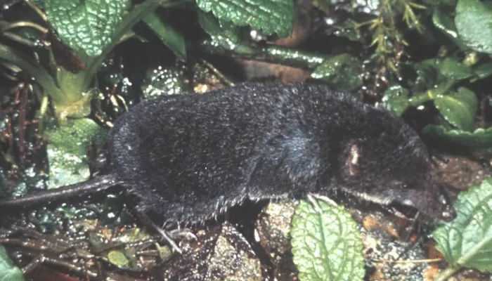 The water shrew is a large shrew, with a silky, dark grey or black back and white underside. It has large hind feet and is the only shrew that is likely to be seen in the water.