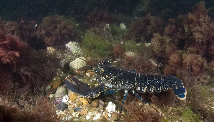 Common lobsters are very familiar animals, with big front pincers and a long body that ends with a wide tail fan. Their pincers are different sizes, with one used for crushing and one for tearing. Lobsters are crustaceans and are related to crabs and even barnacles!Common lobsters live in crevices and excavated hidey-holes amongst rocks beneath the low tide mark and out to depths of 60m. They hide during the day and come out to feed at night. Lobsters are scavengers, searching out food on the seabed, and will eat molluscs, sea urchins and other smaller crustaceans. If you spot a lobster with thousands of tiny jelly balls on their legs, don't worry they're her eggs! Female lobsters carry their fertilised eggs around for up to 12 months to protect them from predators before they hatch. We say a female with eggs is "berried".