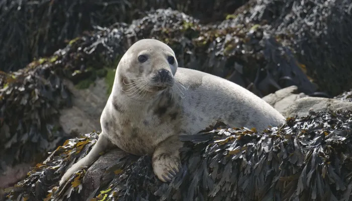The grey seal can be distinguished from the common seal by its larger size and longer head with a sloping 'roman nose' profile. Looking straight on, their nostrils are parallel, rather than v-shaped as in common seals. Mainly grey in colour, the unique pattern of darker blotches and spots can be used to identify individuals.
