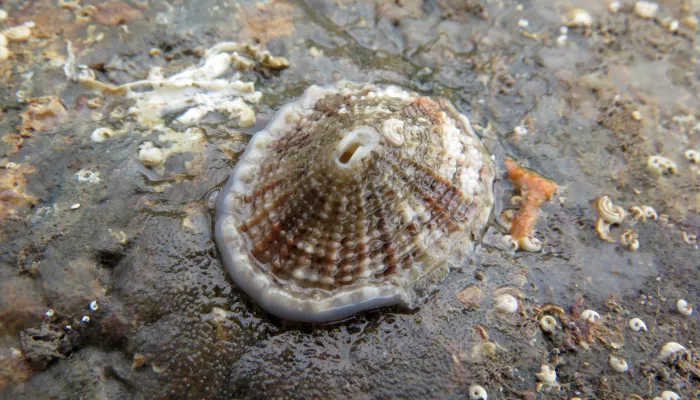 Similar to the common limpet, but more oval in shape and with a characteristic 'keyhole' shaped opening in the top of the greyish shell, through which it breathes when underwater. The shell is around 4cm length and features characteristic bands of green or brown.
