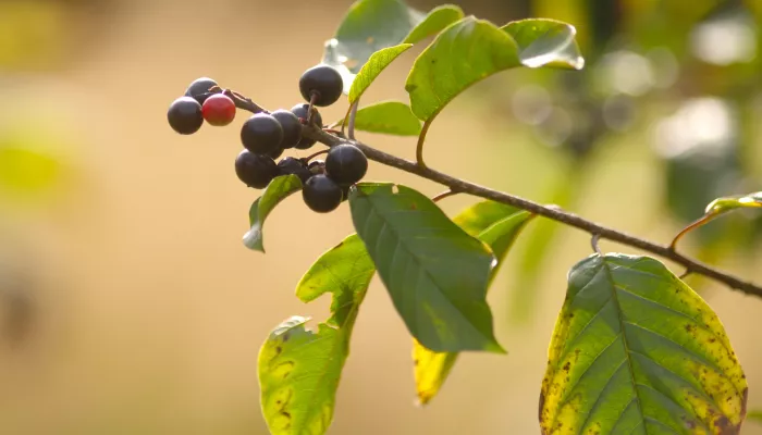 Unlike its relative, Purging buckthorn, Alder buckthorn is a thornless tree. It also has narrower leaves, with wavy margins and rounded tips, and red berries that turn purple.