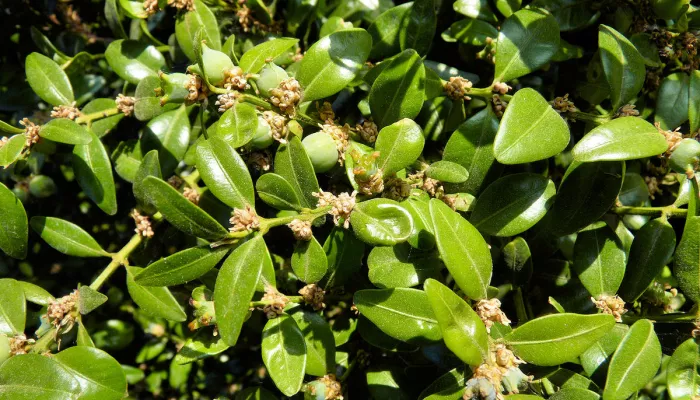 Although not widespread, where common box does occur, it can often be in large numbers and can live for several hundred years. Found in southern England, Box Hill in Surrey is probably the best-known population in the UK. It thrives on hillsides, and in woodlands and scrub; cultivated forms are used as ornamental and hedging plants in gardens, are often clipped into impressive examples of topiary.In April and May, both the female and male flowers can be seen on the same plant. Pollinated by the wind, each female flower dries, becoming a green capsule and then, finally, a brown, woody seed case. Common box is popular with bees and provides a dense, sheltered habitat for small birds, mammals and insects.