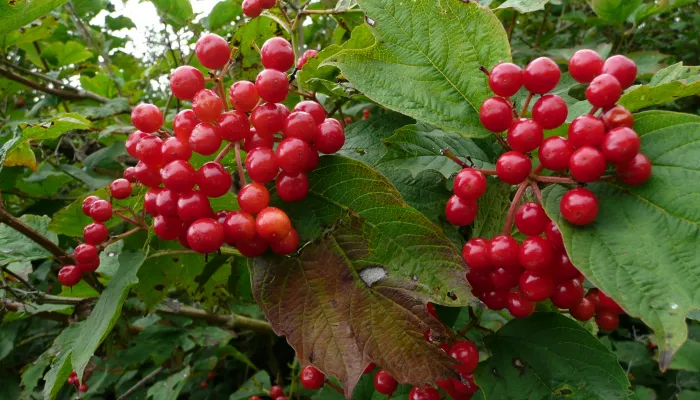 The guelder-rose has broad, lobed leaves that turn red in the autumn. It displays umbels (umbrella-like clusters) of large, china-white flowers in summer, and red berries in autumn.