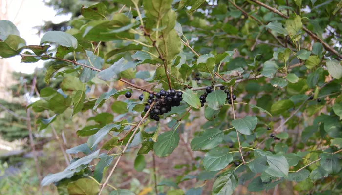 Purging buckthorn is a small, spiny shrub. It displays oval, finely toothed leaves and clusters of black berries.