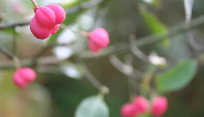 Spindle has slightly square stems and thin, straight twigs; smooth, green bark; narrow, shiny leaves that turn orange-red in autumn; and characteristic pink fruits that contain bright orange seeds.