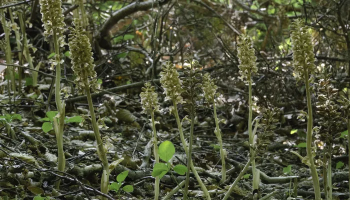 The Bird's-nest orchid is a very strange plant. It is leafless and without the green chlorophyll of other plants that enable them to gain energy from sunlight through photosynthesis; instead, it grows as a parasite on the roots of trees, gaining its nutrients from its host. Usually found in woodland, particularly under Beech trees, this almost sickly looking, yellow plant appears from May to July.