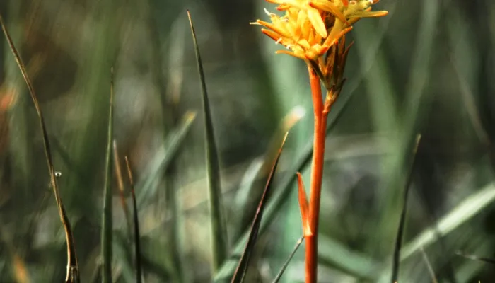 Bog asphodel is unmistakeable when found on the damp, peaty soils it prefers. Look for the pyramidal flower spikes, which carry a dense cluster of yellow, open flowers with protruding, woolly, orange-tipped stamens. The leaves are narrow and set in a flattened fan around the stem. After it flowers, most of the plant turns orange in colour and reddish, egg-shaped fruits appear.Did you know?