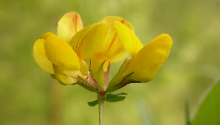 Common bird's-foot-trefoil is a member of the pea family. Its yellow flowers look like little slippers and appear in small clusters. They are followed by seed pods that look distinctly like bird's feet or claws, hence the common name. A low-growing plant, its leaves have five leaflets and are downy.