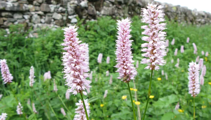 The delicate, pink flowers of Common bistort can crowd damp places, such as wet meadows, pastures and roadside verges. In bloom from June to August, this pretty flower goes by a different name in the north of England: 'Pudding Dock' (or sometimes 'Passion Dock') because it was commonly used to create a traditional pudding around Eastertime, probably originating as a cleansing, bitter dish for Lent. Nowadays, many local places have their own take on the basic recipe of Common bistort leaves, nettles, onions, oatmeal and bacon fat.