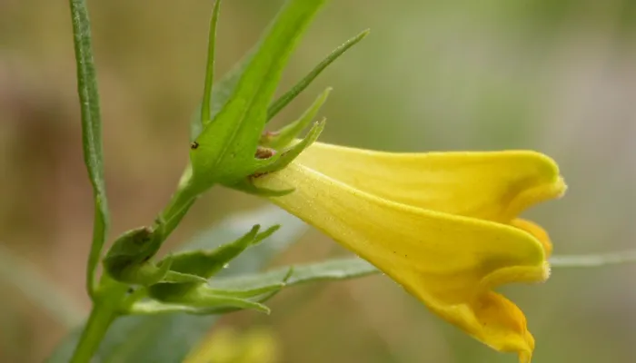 The leaves of Common cow-wheat are narrow and pointed. It has yellow flowers that grow in pairs up the square stem, both facing the same direction; the first pair to emerge are those at the top of the stem.