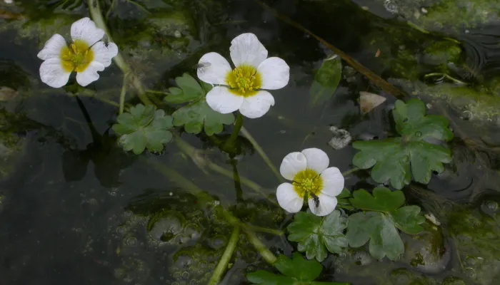 Water-crowfoots are a difficult group to tell apart. Common Water-crowfoot has white flowers, buttercup-like, five-petalled flowers that have a yellow centre. Its floating leaves are circular and lobed (with three to seven lobes); its submerged leaves comprise many segments.