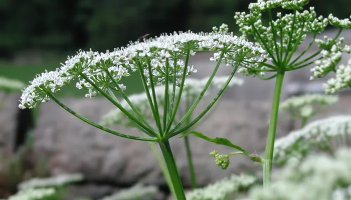 Ground-elder has leaves with three lobes, like a pointed clover-leaf, at the base of its stems. It displays rounded, umbrella-like clusters of small, white flowers.