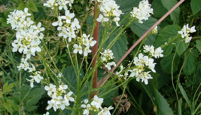Horseradish is a common perennial of waste ground, railway cuttings and roadside verges mainly in England. Arriving here from western Asia sometime before the 16th century, the use of prepared Horseradish roots as a condiment for meat quickly became popular. But the preparation of Horseradish is pretty hard-going - the pungent roots can cause tears worse than those from chopping an onion! Today, commercial production is widespread.