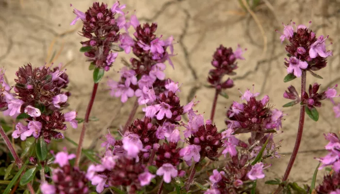 Large thyme has woody, square, reddish stems with hairs on each of the 'corners' of the lower parts of the stem.Its tiny flowers are pinky-purple and grouped in an oblong head. Its oval leaves sit in opposite pairs on the stem and are aromatic when crushed.