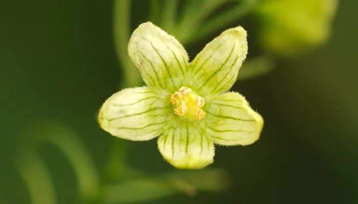 A climbing plant, White bryony has curling tendrils and leaves with five lobes. It displays greenish, five-petalled flowers and orange-red berries.