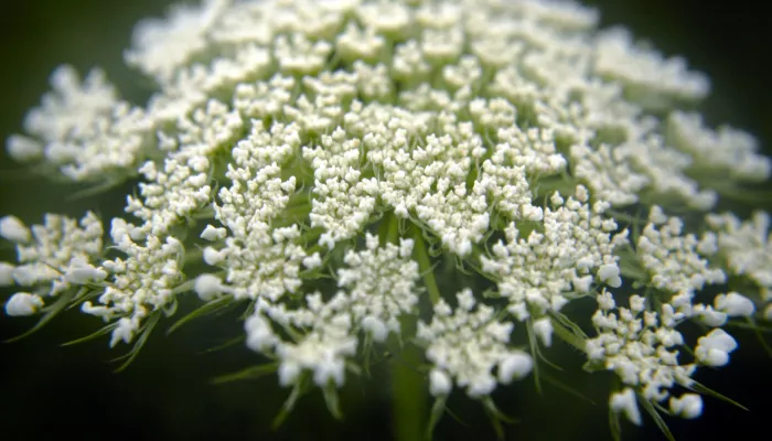 The white umbels of Wild carrot are very densely packed and rounded. Its leaves are divided into narrow leaflets, and the plant is hairy.