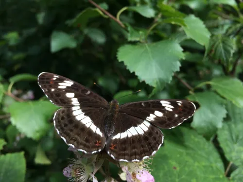 The White admiral is a striking black-and-white butterfly with a delicate flight that includes long glides. It prefers shady woodlands where it feeds on Bramble.
