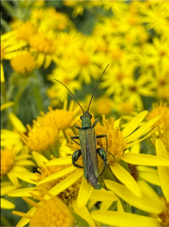 After last year’s insect drought, volunteer David Rayner was delighted to see the flowers of ragwort, Jacobaea vulgaris, with more visitors this July. He says ‘ragwort plants are the main larval food plant of the beautiful cinnabar moth. The flowers, produce unusually large amounts of nectar and pollen which means that they also attract and provide food for a very wide range of pollinating insects. In a single session David identified the following at the golden banqueting table: Nowickia ferox (a tachinid fly), small copper butterfly, red soldier beetle, jewel wasp or ruby-tailed wasp (there are several similar species), Eriothrix rufomaculata - a bristly parasitic fly whose larvae develop and feed inside moth larvae, 7-spot ladybird, Lygus pratensis (plant bug), thick-thighed beetle (male) and green-eyed flower bee Anthophora bimaculate which is a heathland specialist.