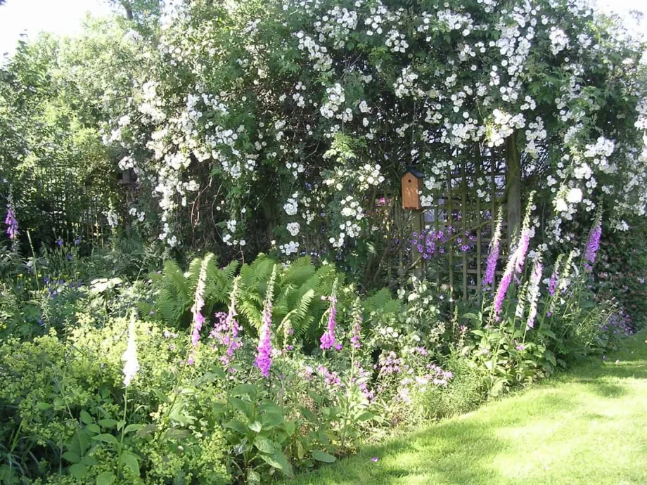 Our greenhouse area is hidden behind trellis covered in climbing rose and honeysuckle. © P Brook
