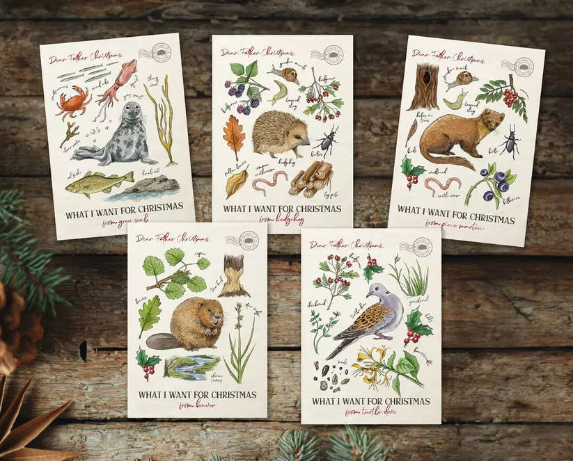 You can also spread your love of our wild world by choosing Kent Wildlife Trust’s bespoke Christmas cards. Thoughtfully designed by talented in-house designer Katy McCarten, each card highlights the essential elements that these animals rely on to thrive, from natural habitats to food sources. The cards also depict each species’ heartfelt Christmas wish to Father Christmas, asking for simple yet vital gifts like safe homes, abundant food, and clean environments.